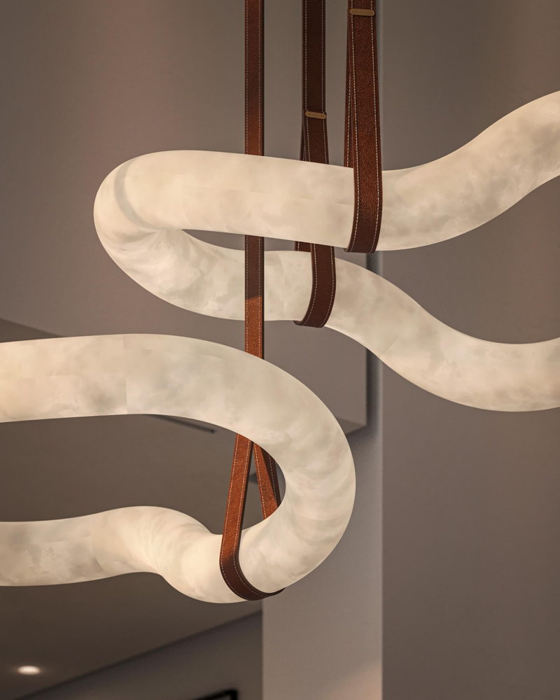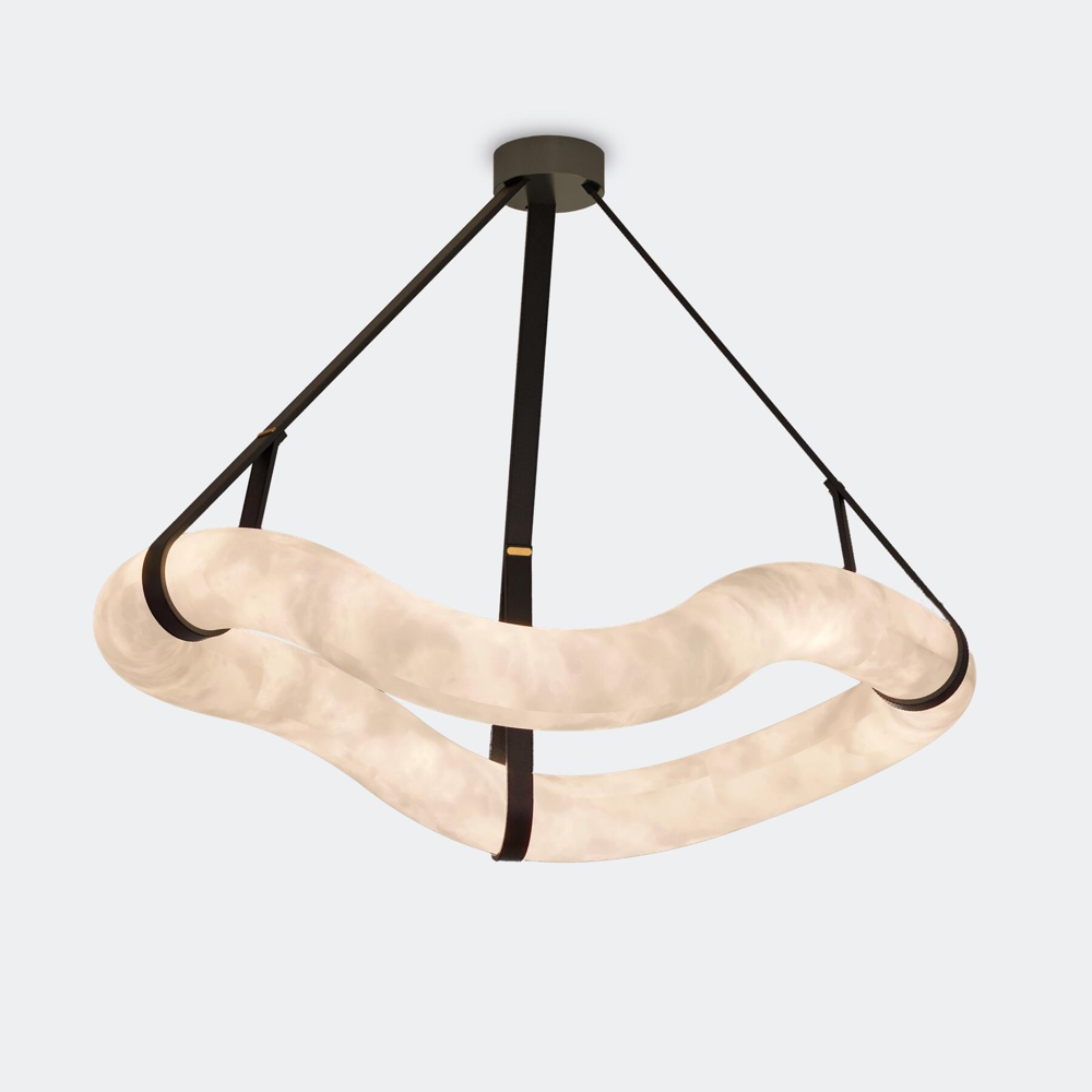 Designed by Alain Ellouz for HOLLY HUNT’s L’Albâtre Collection, the Dune Hanging Light fuses raw luxury with fluid form. Its alabaster waves, suspended in hand-stitched leather, radiate a warm, sculptural glow that feels both weightless and daringly refined. A testament to Ellouz’s mastery of light and stone, it transforms illumination into an art form - serene, tactile, and unmistakably distinctive.